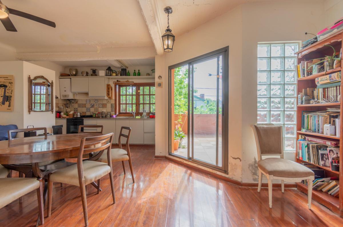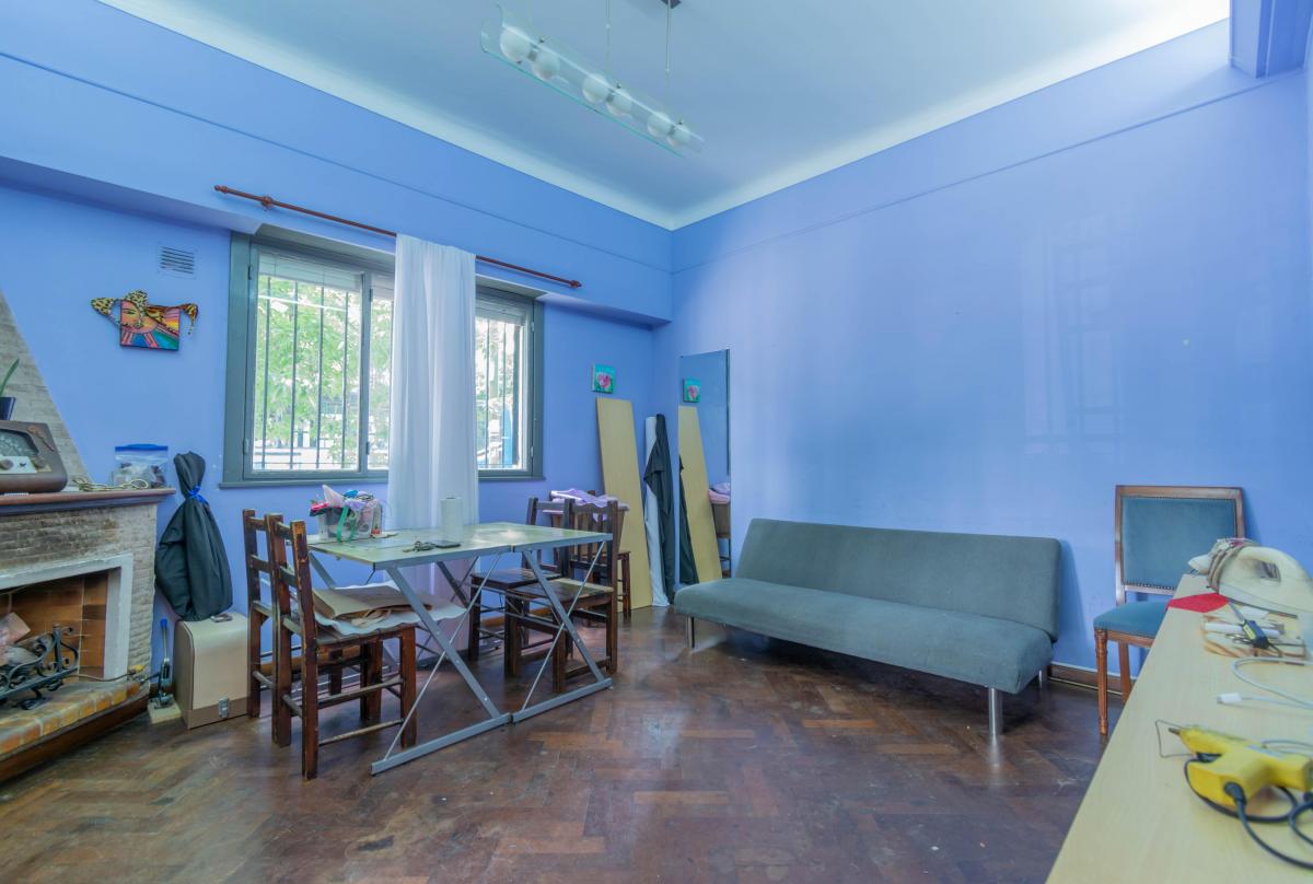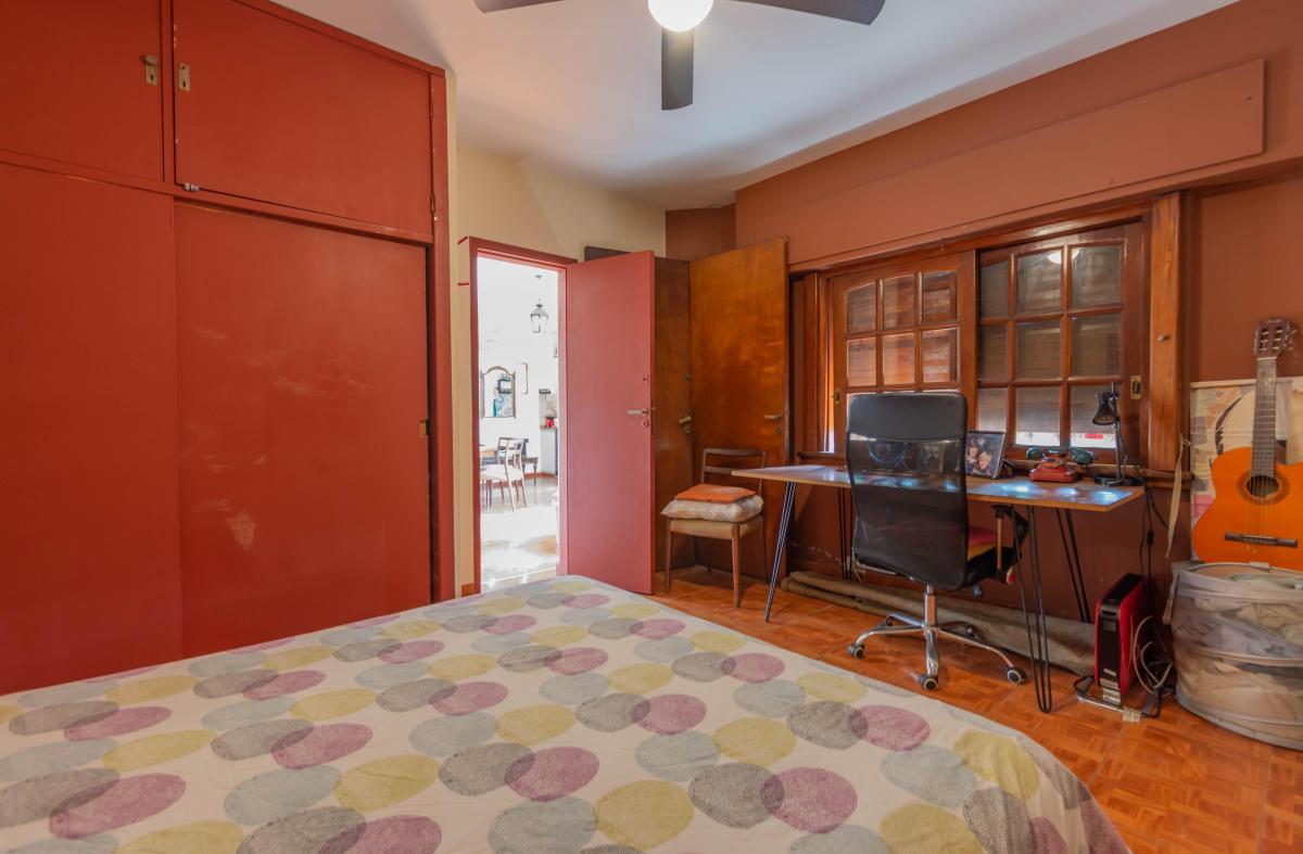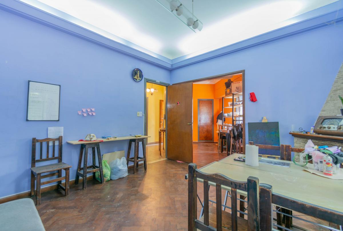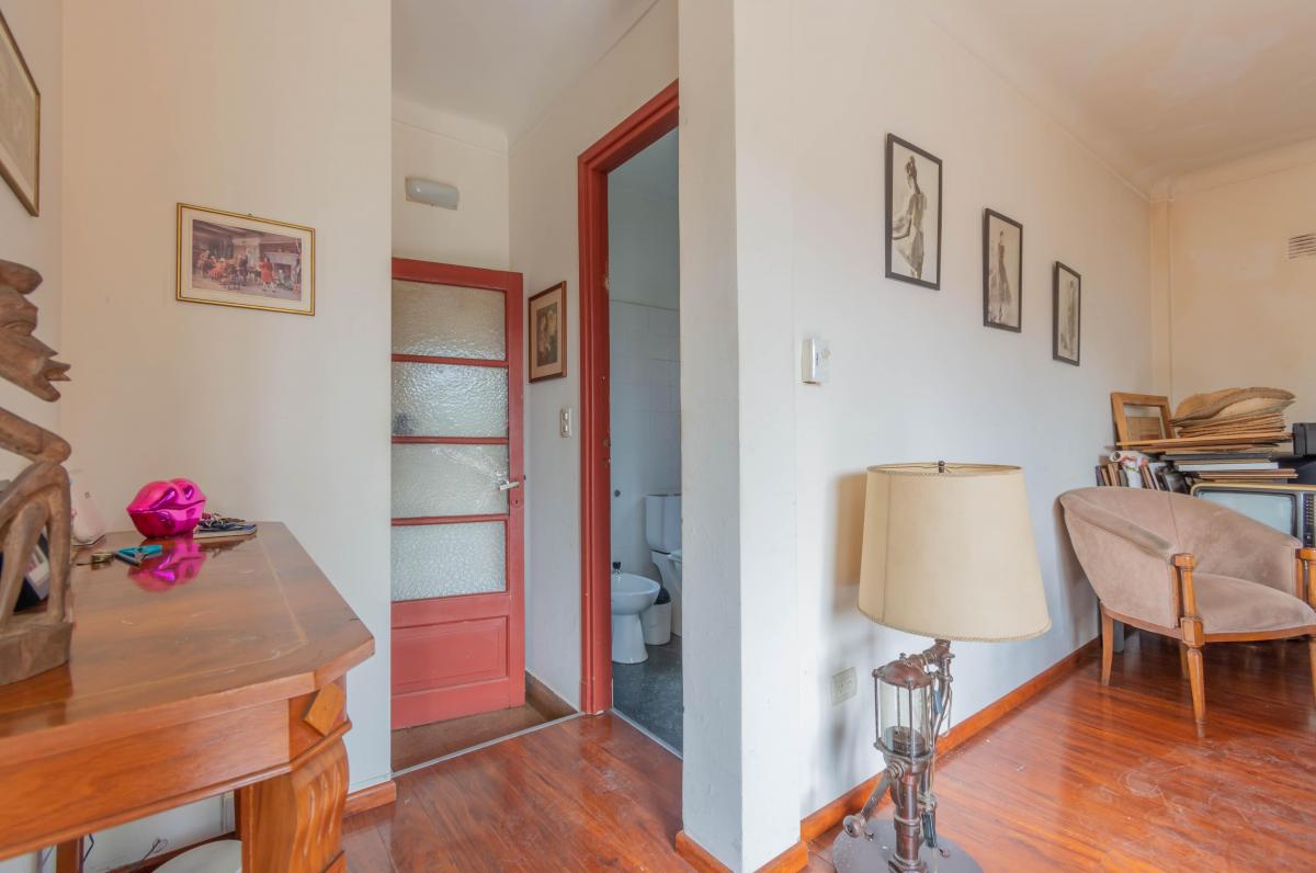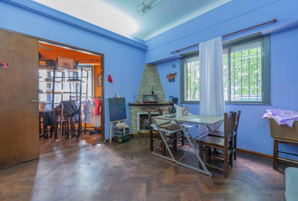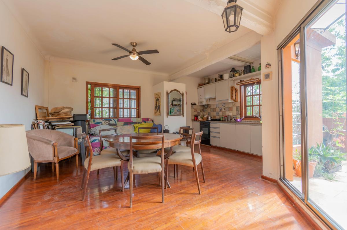 Se ingresa por Roque Pérez a un amplio hall, que distribuye al estar comedor con cocina integrada y a dos dormitorios, todos dando a la calle, muy luminosos y alegres. Un baño completo y hermoso patio jardín integrado a la cochera descubierta. Todo con materiales de época: pisos de parquet, carpinterías de madera. Baulera bajo escalera.